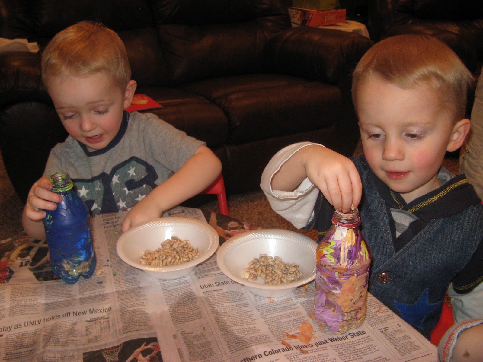 Craft- After snack we finished our, now dry, maracas by putting beans inside them. The kids had fun shaking them around and seeing what kind of music they could make with their new instruments.